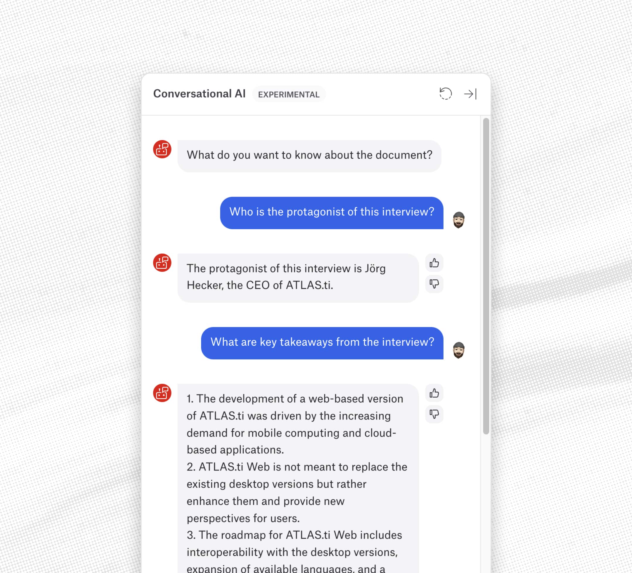 At ATLAS.ti, we believe that AI will revolutionize data analysis by increasing speed and efficiency. As a pioneering software company in our field, we have integrated OpenAI's leading GPT model for AI-driven assistance. Widely recognized as one of the most advanced in the industry, it is known for its human-like language comprehension and interpretation.