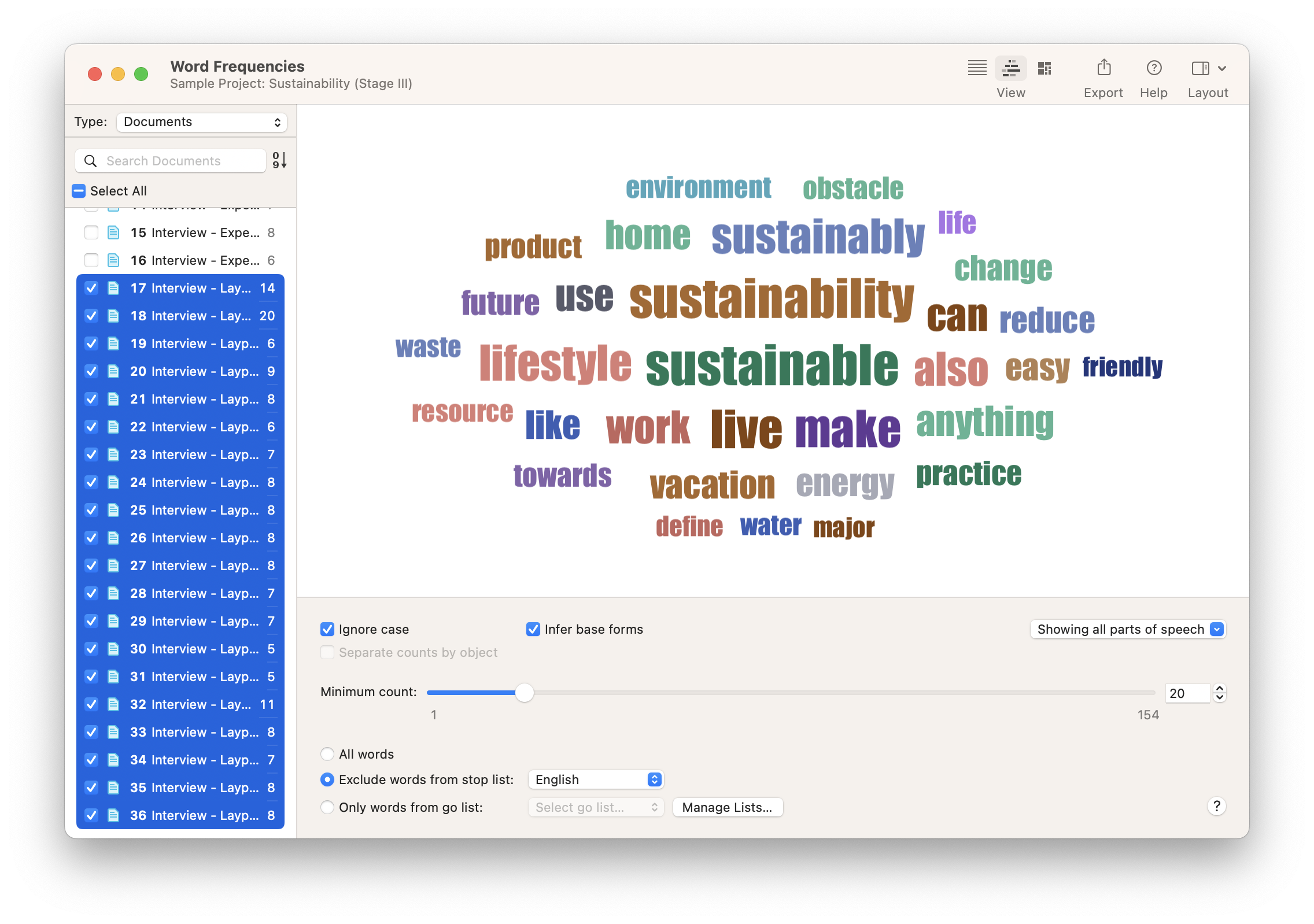 La herramienta Nube de Palabras de ATLAS.ti determina las frecuencias y crea la visualización rápida y fácilmente. Todo lo que el investigador necesita hacer es seleccionar los documentos que quiere analizar. Luego pueden refinar su nube de palabras incluyendo o excluyendo ciertas clases de palabras, como adverbios o determinantes, o estableciendo una frecuencia mínima requerida para que la palabra aparezca en la nube.