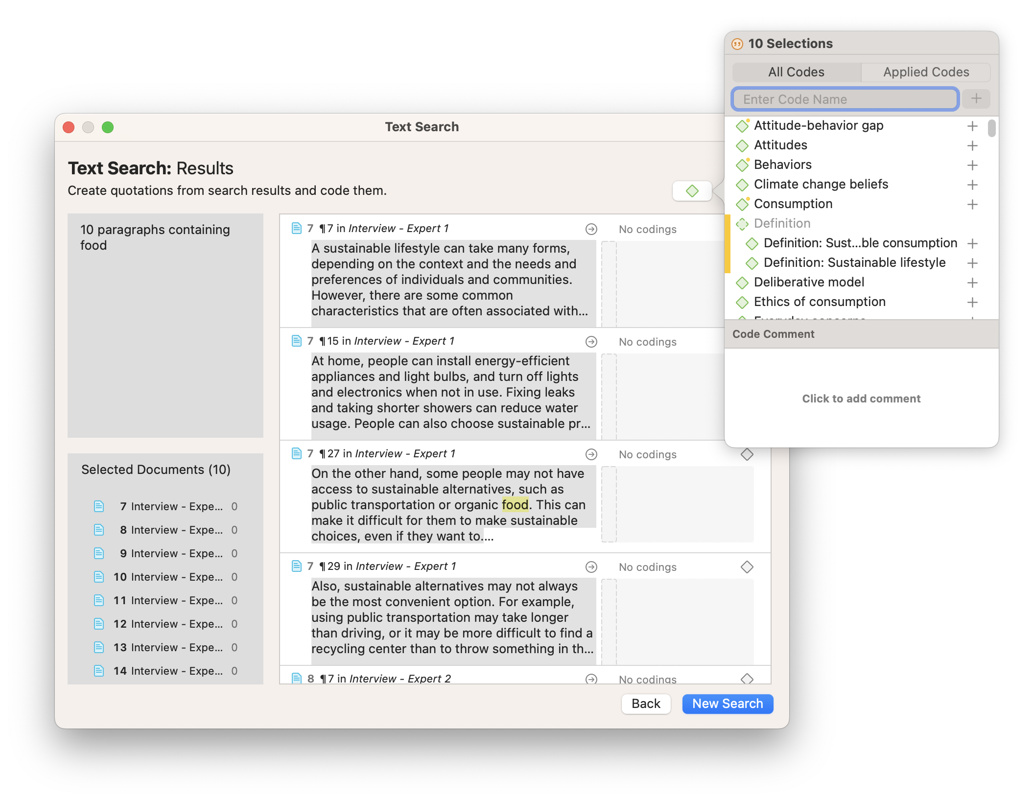 In ATLAS.ti, manual coding is simply a matter of highlighting text and choosing from existing codes or creating new ones to apply to the data. A pop-up window that displays your code list near your text makes the coding process quick and easy. Quick Coding allows users to apply the most recently used code to any data segment with just a few clicks, while the Code In Vivo option creates codes directly from the text.
