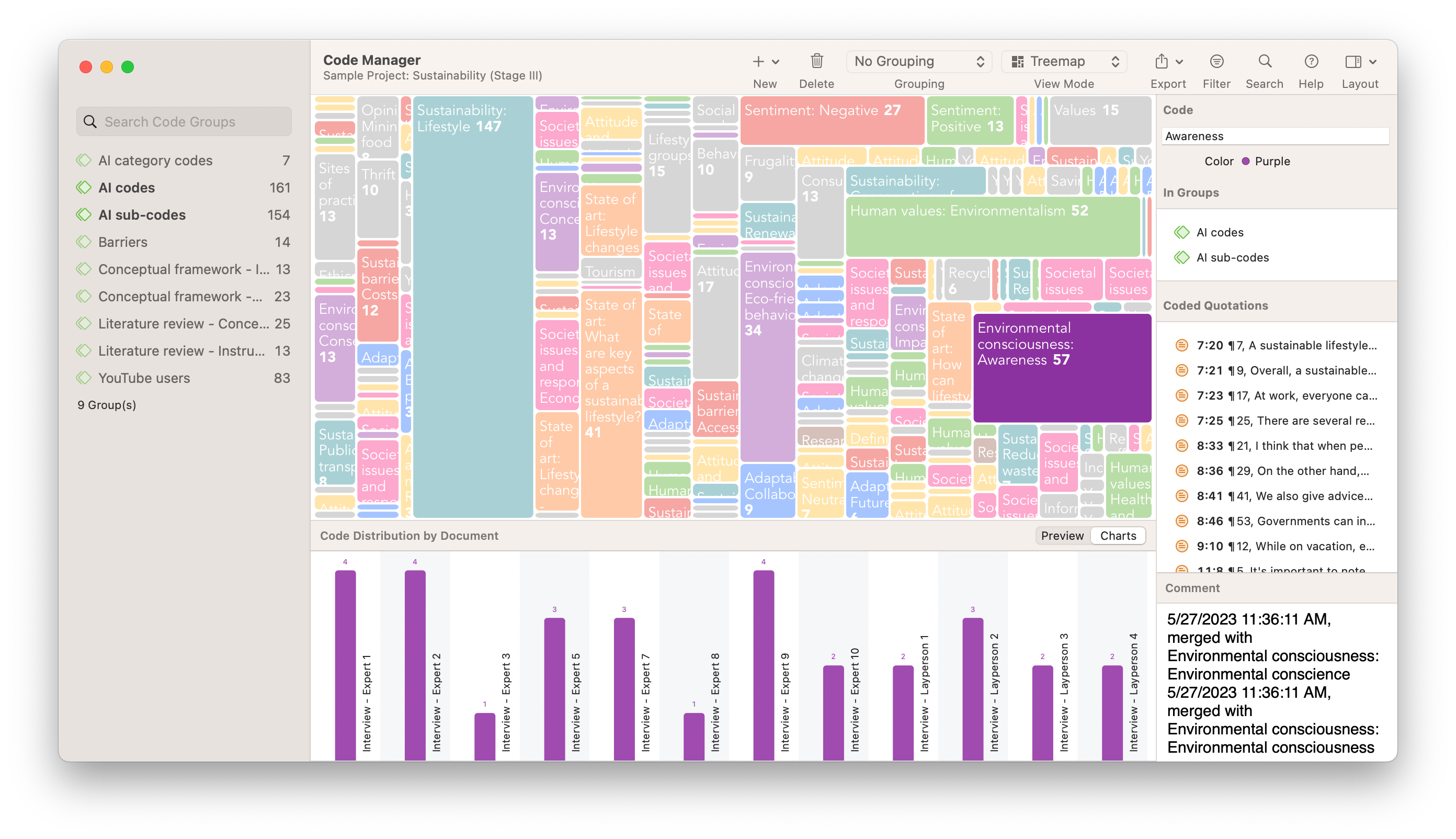 ATLAS.ti excels in data organization with an intuitive Document Manager, allowing you to sort documents by multiple categories represented by document groups. Document groups provide a level of flexibility not seen in MAXQDA, which provides a traditional file system for documents that might limit the organization of data if your documents simultaneously belong to multiple categories or analyses.