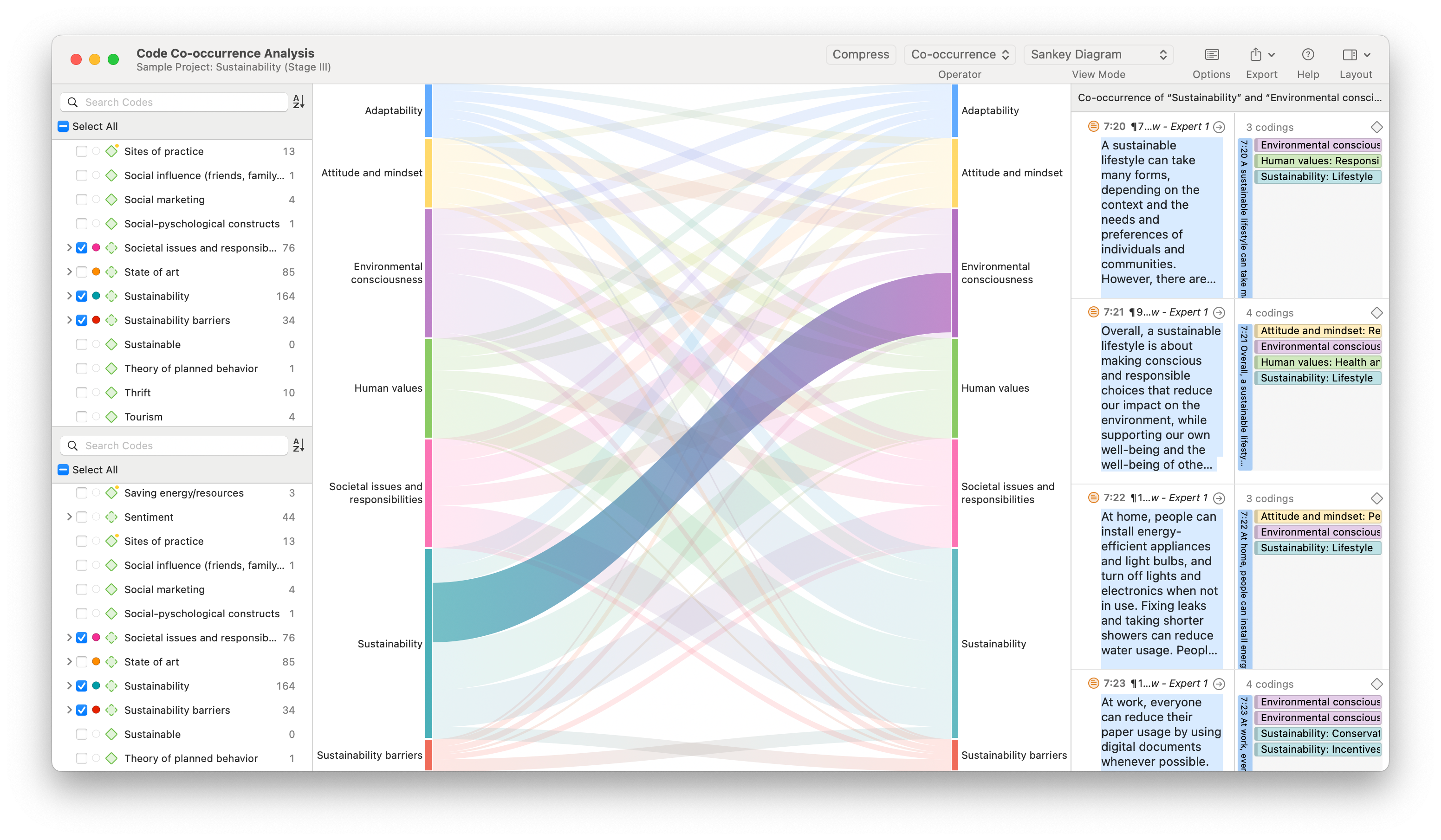 Once created, tables from Code Co-Occurrence Analaysis and Code-Document Analysis can be used to provide visualizations in the form of force-directed graphs and Sankey diagrams, visualizations that are only available in ATLAS.ti.