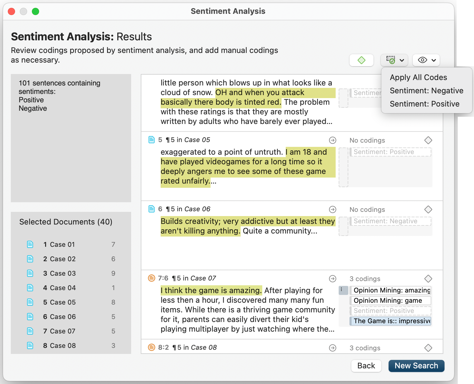 For example, as soon you’ve received the responses to your survey, you might want to examine how each person feels about the topic you’re studying. Sentiment Analysis makes it easy for you to dig into the reactions and feelings that came up: you can see all the results in one list and you can instantly code the findings using ATLAS.ti’s suggested codes for each of the sentiments. With one click, you can have all the feelings in your data coded, paving the way for you to explore which sentiments were predominant across participants, compare different groups of participants, and more.