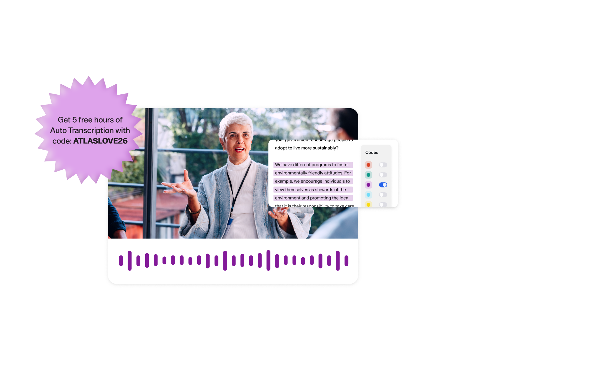 Streamline your analysis with 5 free hours of Auto Transcription Convert audio and video into text up to 20× faster, freeing up time to focus on insights*. Redeem your transcription hours with promo code: ATLASLOVE26